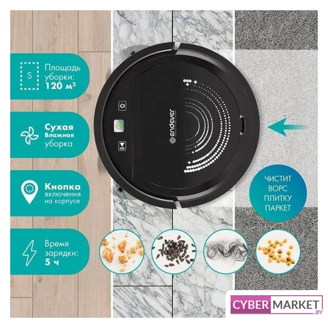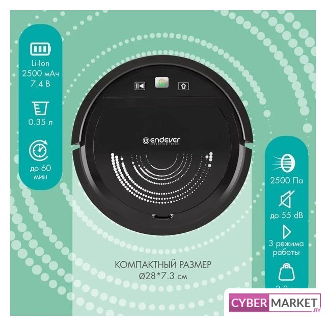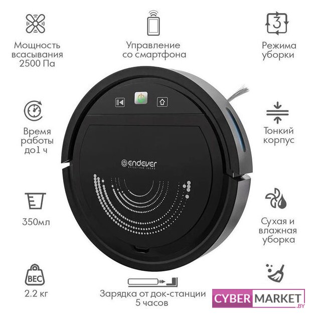 сухая уборка, сила всасывания 800 Па, пылесборник 0.45 л, навигация: контактный бампер, датчики перепада высоты