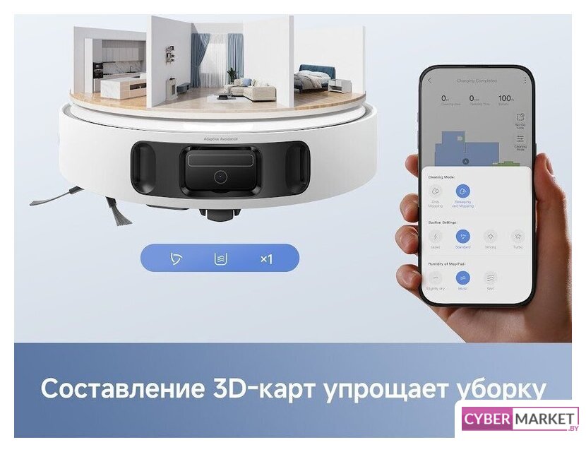 влажная уборка, Mi Home, мощность 55 Вт, сила всасывания 8000 Па, с турбощеткой, навигация: контактный бампер, лидар, датчики перепада высоты, лазерные датчики препятствий, план нескольких этажей, база самоочистки