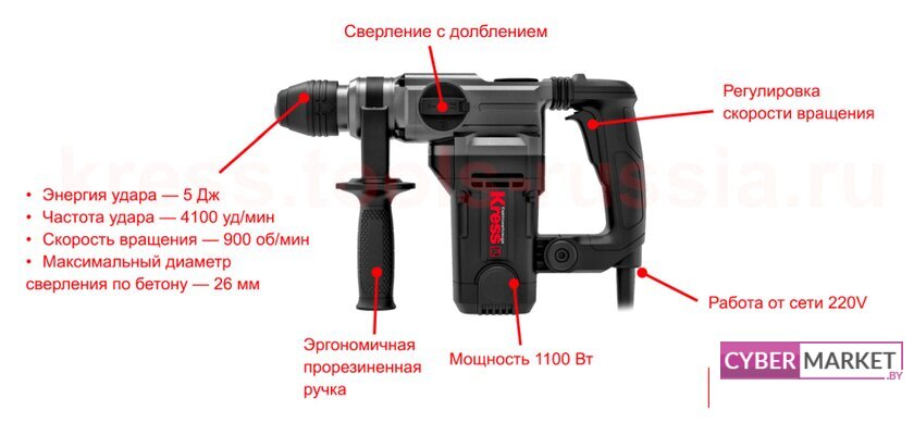 1100 Вт, питание: сеть, 4100 ударов/мин, энергия удара: 5 Дж, 5300 г