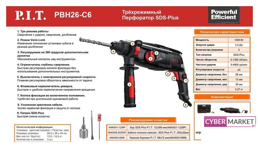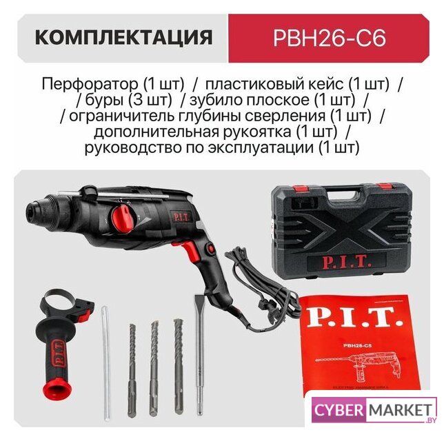 | Комплект поставки | - Перфоратор, - пластиковый кейс, - буры (3 шт.), - зубило плоское, - ограничитель глубины сверления, - дополнительная рукоятка, - инструкция по эксплуатации |