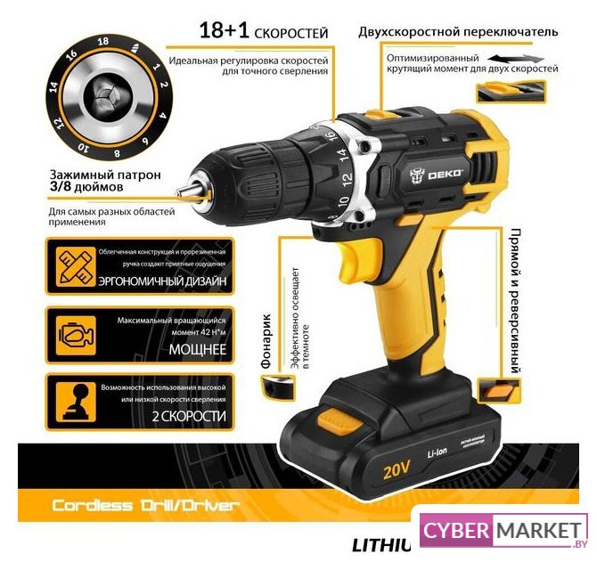 дрель-шуруповерт, аккумулятор 20V, Li-ion, патрон быстрозажимной, 2 скорости, режимы: сверление/шуруповерт