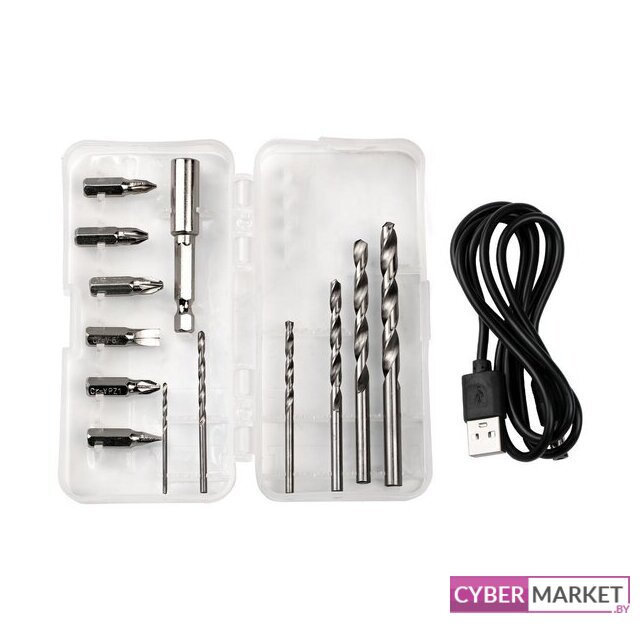 | Комплектация | - Дрель-шуруповерт аккумуляторная 1 шт. - Руководство по эксплуатации 1 шт. - Кабель зарядки USB 1 шт.- Сверло 6 шт.- Бита 6 шт.- Переходник для бит 1 шт.- Кейс |