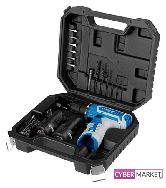 | Комплектация | - Дрель-шуруповерт- Аккумулятор – 2 шт.- Зарядное устройство- Бит насадки – 6 шт.- Сверла – 6 шт.- Держатель магнитный для бит- Кейс |