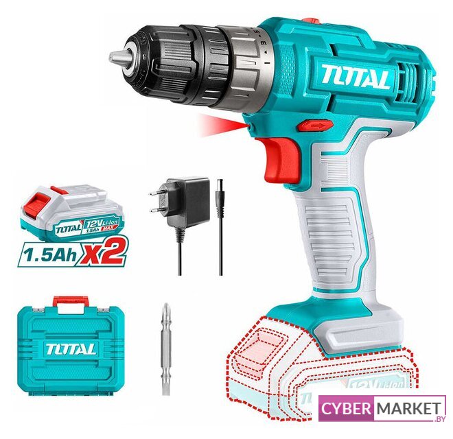 | Комплектация | - Дрель-шуруповерт - 1 шт.- Аккумулятор 1,5 Ач - 2 шт.- Зарядное устройство - 1 шт.- Бита - 1 шт.- Инструкция- Кейс |