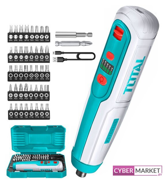 | Комплектация | - Бита (25 мм) - 40 шт.- Биты (50 мм) - 1 шт.- Магнитный держатель бит - 1 шт.- Кабель Micro USB для зарядки - 1 шт.- Инструкция- Кейс |
