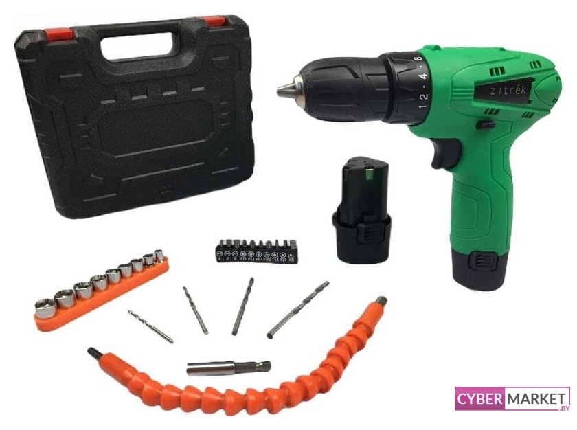 | Комплектация | - Дрель аккумуляторная Zitrek Green 12 - 1 шт.- Литиевый аккумулятор 1,5Ач - 2 шт.- Набор бит - 1 шт. (прямой шлиц - 4,5,6мм, PZ1,PZ2,PH1,PH2,T15,T20,AD)- Набор головок - 1 шт. (головка торцевая - 5,6,7,8,9,10,11,12,13мм)- Гибкий удлинитель - 1 шт.- Удлинитель - 1 шт.- Сверла универсальные - 4 шт. (3,4,5,6мм)- Зарядное устройство - 1 шт.- Руководство по эксплуатации - 1шт.- Кейс пластиковый - 1 шт. |