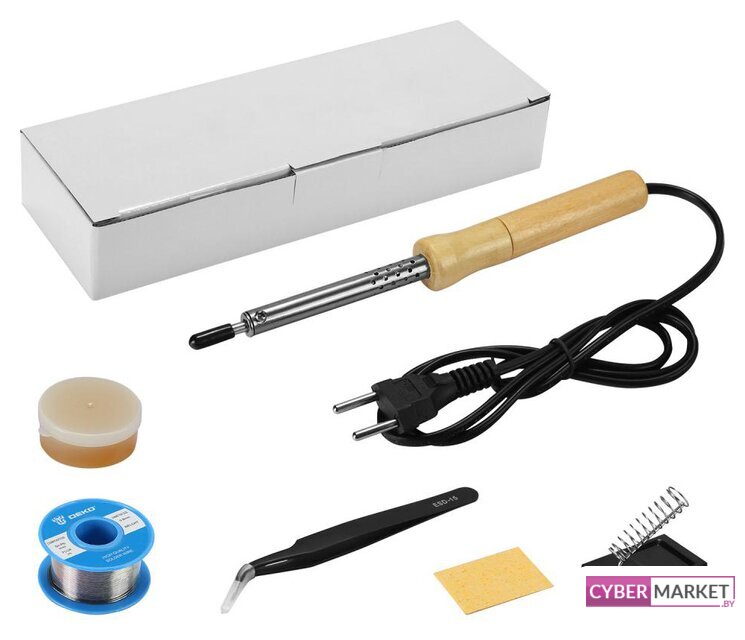 | Комплектация | - Паяльник 30 Вт, 220 В- Подставка для паяльника- Губка для очистки паяльного жала- Пинцет- Припой на катушке- Канифоль- Коробка |