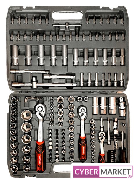 | Комплектация | Головки торцевые 6 граней ½: 10-32 ммГоловки торцевые TORX ½: 20-24 ммГоловки торцевые глубокие ½: 16-22 ммУдлинители ½: 125 и 250 ммАдаптер ½ *3/8Трещотка ½ ¼ 3/8: 72 зубаШарниры карданные ½, ¼, 3/8Свечные головки ½: 16 и 21 ммСоединители ½, ¼, 3/8 Биты 8мм: SL8,10,12. PH3,4. T40,45,50,55,60,70. TH40,45,50,55,60,70. PZ3,4. H7,8,10,12,14.Ключи шестигранные Г-образные: 1,27-5 ммГоловки торцевые 6 граней 3/8: 10-19 ммГоловки торцевые TORX 3/8: 10-18 ммГоловки глубокие 6 граней 3/8: 10-15 ммГоловка свечная 3/8: 18 ммУдлинитель 3/8: 150 ммГоловки торцевые 6 граней ¼: 4-14 ммГоловки торцевые TORX ¼: 4-8 ммГоловки глубокие ¼: 4-10 ммУдлинители ¼: 50 и 100 ммРукоятка-отвертка для бит ¼: 153 ммВороток ¼: Т-образный Биты ¼: H2,3,4,5,6. SL4,5.5,7. PH1-2-3. PZ1,2,3. T8,9,10,15,20,25,27,30.T8H, T9H, T10H, T15H, T20H, T25H, T27H, T30HБиты (6,35 мм) ¼: PH0,1,2,3. PZO1,2,3. H4,5,6. SL4,5,6. T10,15,20,25,27,30. |
