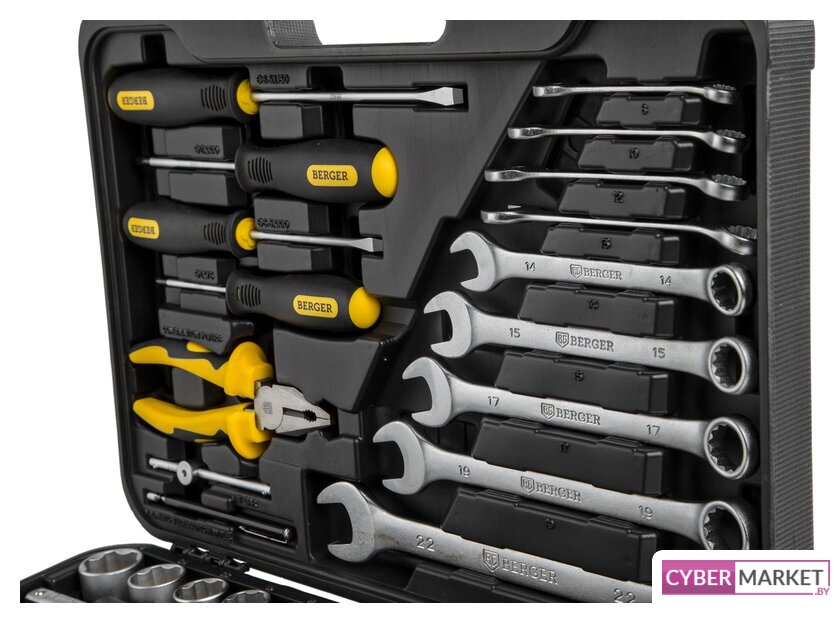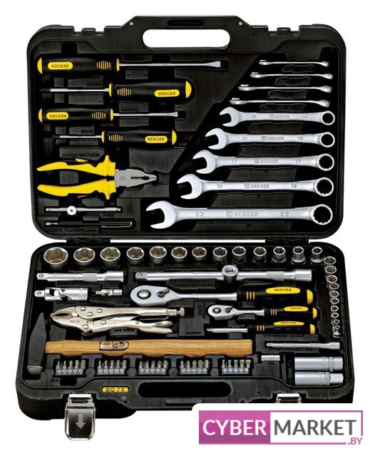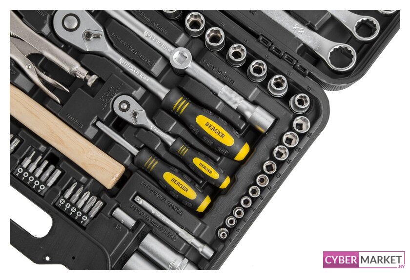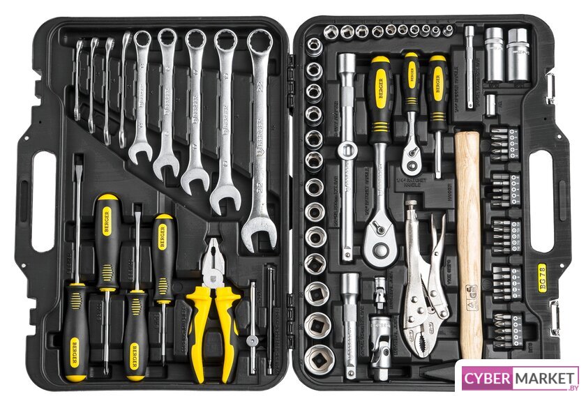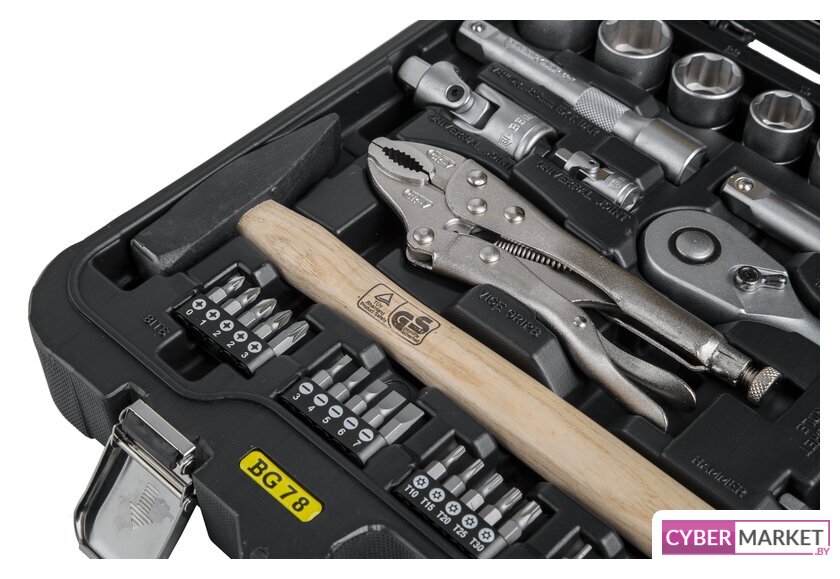 | Комплектация | - 10 шт.: 1/4" Головки торцевые 6-гранные Super Lock: 4, 5, 6, 7, 8, 9, 10, 11, 12, 13 мм- 1 шт.: 1/4" Трещотка (ключ трещоточный с быстрым сбросом): 45 зубов- 1 шт.: 1/4" Удлинитель: 100 мм- 1 шт.: 1/4" Отвертка с присоединительным квадратом- 1 шт.: 1/4" Кардан шарнирный- 1 шт.: 1/4" Вороток Т-образный: 110 мм- 1 шт.: 1/4" Адаптер для бит- 25 шт.: 1/4" Биты в пластиковом держателе:PH (крест): 0, 1, 2, 3, 4PZ (позидрайв): 0, 1, 2, 3, 2Torx (звёздочка): T10, T15, T20, T25, T30Slot (шлиц): 3, 4, 5, 6, 7Hex (шестигранник): 2, 3, 4, 5, 6- 13 шт.: 1/2" Головки торцевые 6-гранные Super Lock: 10, 11, 12, 13, 14, 15, 16, 17, 18, 19, 22, 24, 27 мм- 2 шт.: 1/2" Головки свечные магнитные: 16, 21 мм- 1 шт.: 1/2" Трещотка (ключ трещоточный с быстрым сбросом): 45 зубов- 2 шт.: 1/2" Удлинитель: 125, 250 мм- 1 шт.: 1/2" Шарнир карданный- 1 шт.: 1/2" Переходник скользящий- 1 шт.: Молоток (деревянная ручка): 300 грамм- 9 шт.: Ключи комбинированные: 8, 10, 12, 13, 14, 15, 17, 19, 22 мм- 1 шт.: Зажим с фиксатором- 1 шт.: Пассатижи: 180мм- 4 шт.: Отвертки:Slot (шлиц): 5.5x100, 6.5x150 ммPH (крест): 1x75, 2x100 мм- 1 шт.: Ручка магнитная телескопическая |