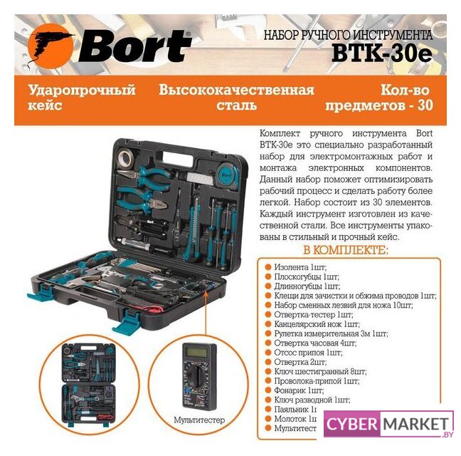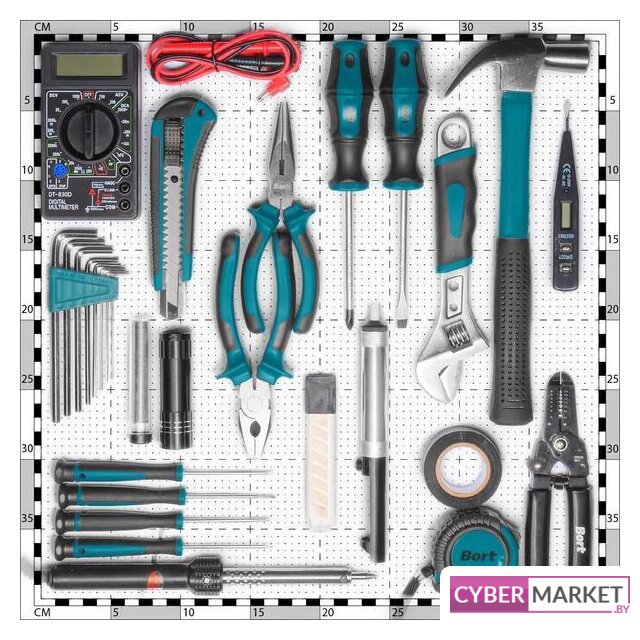 | Комплектация | - Изолента (1 шт)- Плоскогубцы (1 шт)- Длинногубцы 160мм (1 шт)- Приспособление для зачистки проводов (1 шт)- Набор сменных лезвий для ножа (10шт) (1 шт)- Отвертка-тестер (1 шт)- Канцелярский нож (1 шт)- Рулетка измерительная 3м (1 шт)- Отвертка часовая (4 шт)- Отсос припоя (1 шт)- Отвертка (2 шт)- Ключ шестигранный (8 шт)- Проволока-припой (1 шт)- Фонарик (1 шт)- Ключ разводной (1 шт)- Паяльник (1 шт)- Молоток (1 шт)- Мультитестер (1 шт)- Кабель со щупом (2 шт)- Кейс (1 шт) |