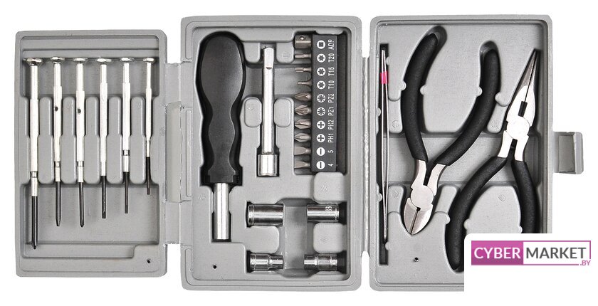 | Комплектация | - Пассатижи- Кусачки- Пинцет- 4 сменных торцевых ключа 6, 8, 10, 12 мм- Отвертка с 9 насадками:Звездочка: T10, T15, T25Крест: PZ1, PZ2, PH1, PH2Шлиц: 1/4", 3/16"- Переходник-насадка- Удлинитель-насадка- 6 часовых отверток- Крест - 2шт- Шлиц: 1.2, 1.5, 2, 3 мм |