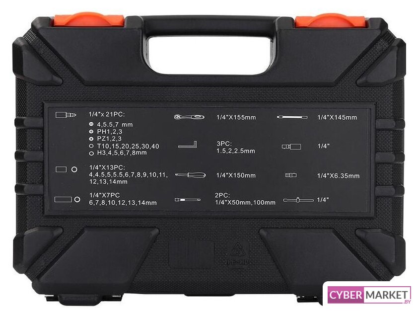 | Комплектация | - универсальный шарнир 1/4"- насадки для бит 1/4" T10; T15; T20- насадки с разъемами 1/4" 4мм; 5,5мм; 7мм- насадки с разъемами 1/4" PZ1; PZ2; PZ3- насадки с разъемами 1/4" #1; #2; #3- насадки с разъемами 1/4" T25; T30; T40- удлинитель1/4" длина 4" (100мм)- вороток 1/4" T-образный- удлинитель гибкий 1/4" длина 6" (150мм)- удлинитель1/4" длина 2" (50мм)- соединительный адаптер 1/4"- ключи шестигранные 1,0мм; 1,5мм; 2,0мм; 2,5мм- насадки торцевые 1/4" со - вставками-битами шестигранными H3; H4; H5; H6; H7; H8- головки торцевые 1/4" 4,0; 4,5; 5,0; 5,5; 6,0; 7,0; 8,0; 9,0; 10,0; 11,0; 12,0; 13,0; 14,0 мм- рукоятка трещоточная 1/4"- рукоятка отверточная 1/4"- головки торцевые глубокие 6,0; 7,0; 8,0; 10,0; 12,0; 13,0; 14,0 мм |