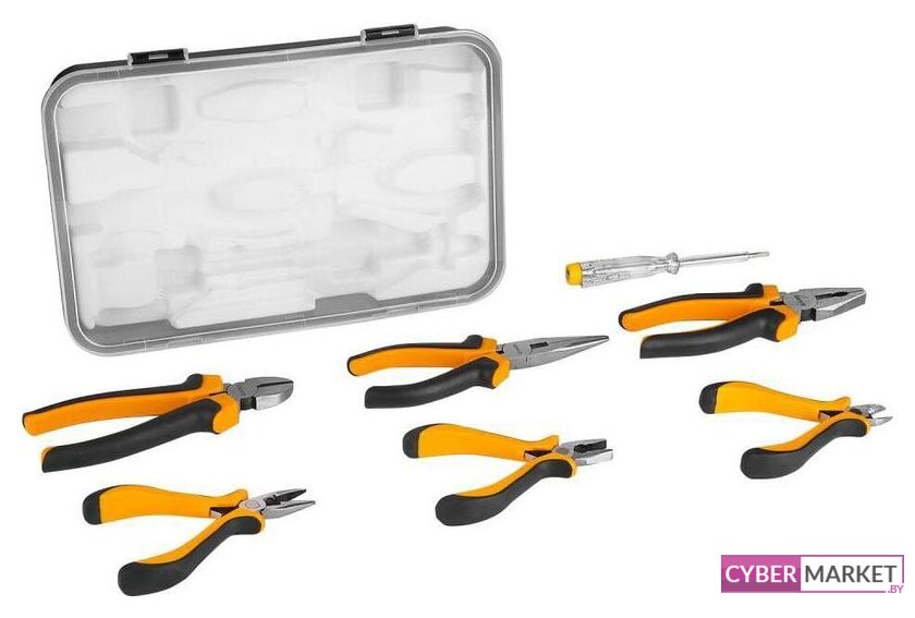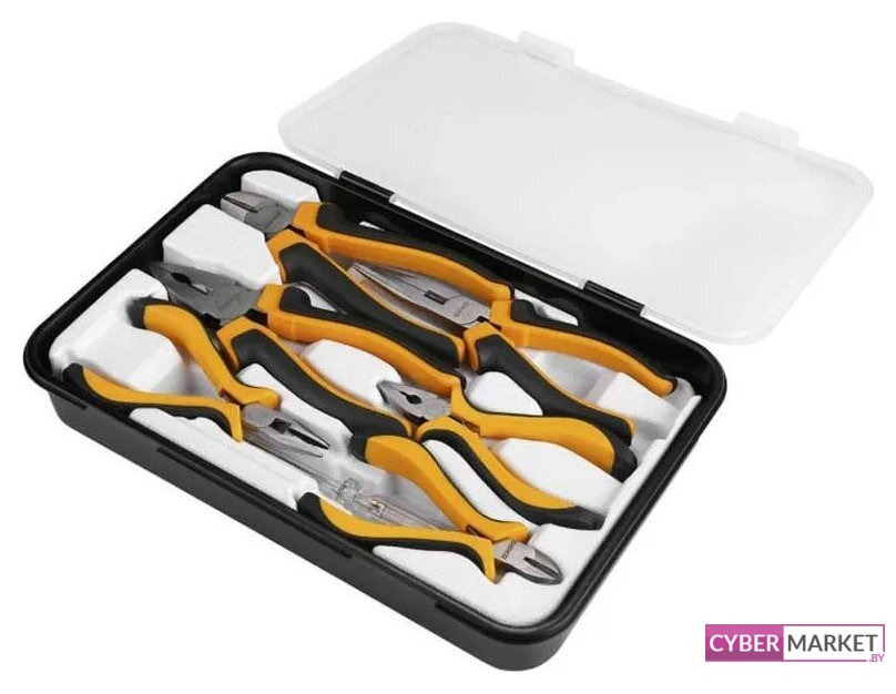 | Комплектация | - Комбинированные плоскогубцы 4.5"", 6"" - 2 шт- Длинногубцы 4.5", 6" - 2 шт- Бокорезы 4.5", 6" - 2 шт- Тестер напряжения 220В - 1 шт- Кейс |