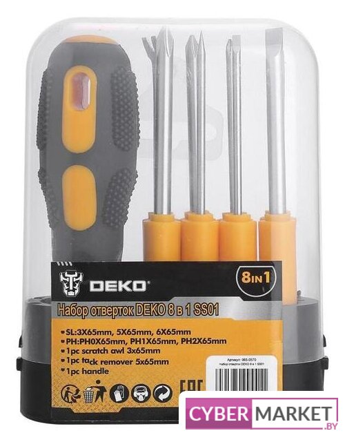 | Комплектация | Slotted:3х65мм,5х65мм,6х65мм - 3 шт Phillips:PH0х65мм,PH1х65мм,PH2х65мм - 3 шт Чертилка 3х65мм - 1 штГвоздодер для гвоздей и кнопок 5х65мм - 1 штРукоятка - 1 шт |