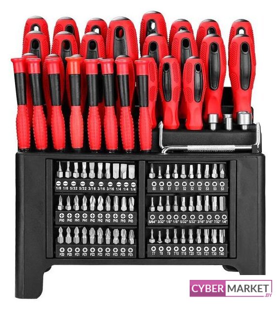 | Комплектация | 8 шт отвертки SL: 3x75, 3x100, 4x100, 5x75, 5x100, 6x100, 6x150, 8x1507 шт отвертки PH: 3x75, 3x100, 4x100, 5x75, 5x100, 6x100, 6x1501 шт отвертка PZ: 6x1502 шт отвертки S: 1x100, 21005 шт отвертки T: 8X75, 10X75, 15X75, 20X100, 25X1002 шт прецизионные отвертки SL: 1.5x50, 2.5x502 шт прецизионные отвертки PH: 2.5x50, 30x504 шт прецизионные отвертки T: 6x50, 7x50, 8x50, 9x5060 шт биты: SL3x2,SL4x2,SL5x3,SL6x3 PZ0x2, PZ1x2, PZ2x3, PZ3x3 PH0x2, PH1x2, PH2x3, PH3x3 S0x2,S1x2,S2x3,S3x3 H2,H2.5,H3x2,H4x2,H5x2,H5.5,H6 T7,8,9,10,15,20,25,27,30,406 шт бита головка: 3/16,1/4,9/32,5/16,3/8,7/162 шт z-образный ключ: 5, 6мм1 шт подставка |