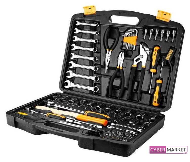 | Комплектация | - 8 шт. комбинированные ключи,- 1 шт. бокорезы,- 1 шт. плоскогубцы с длинным носом,- 8 шт. шестигранные ключи,- 1 шт. переставной ключ,- 2 шт. отвертки,- 1 шт. щетка,- 6 шт. бита шестигранная,- 1 шт. быстросменная отвертка с трещоткой,- 1 шт. тестер давления в шинах,- 1 шт. молоток,- 2 шт. трещотка,- 25 шт. головки,- 3 шт. удлинитель,- 2 шт. универсальный шарнир,- 50 шт. биты: SL3,3,4,5,6, PH0,0,1,1,2,2,3,3, PZ0,0,1,1,2,2,3,3, H1.5,1.5,2,2,3,4,4,5,5,5.5,6,6, T10,15,20,25,27,30,35, S0,0,1,1,2,2,3,3 |