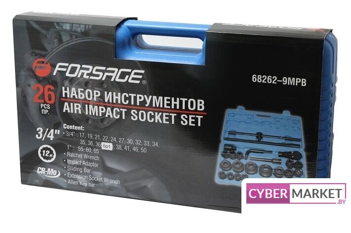 | Комплектация | Торцевые головки 12гр.:3/4'': 17, 19, 22, 24, 27, 30, 32, 33, 34, 35, 36, 36-6гр, 38, 41, 46, 50мм1'': 55, 60, 65ммТ-образный вороток;- Удлинители;- Трещотка. |