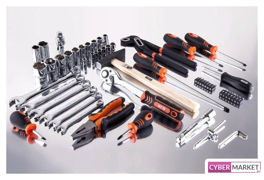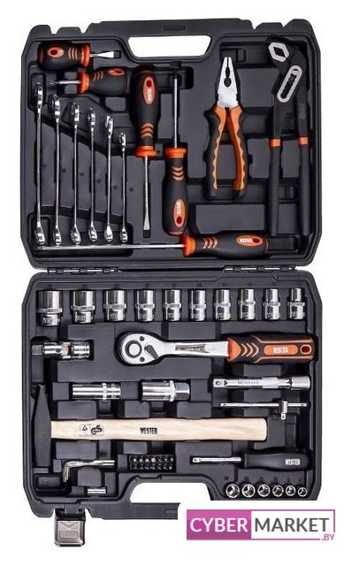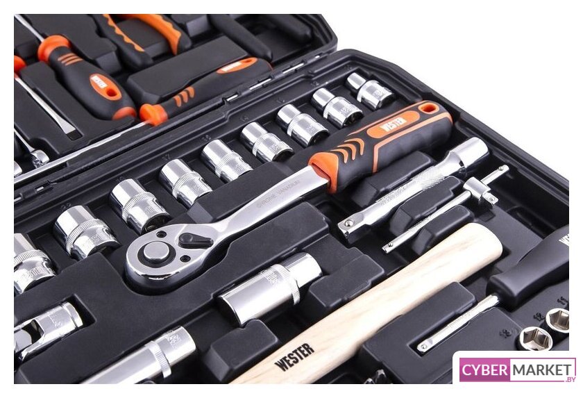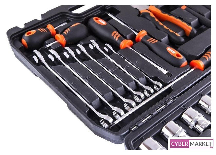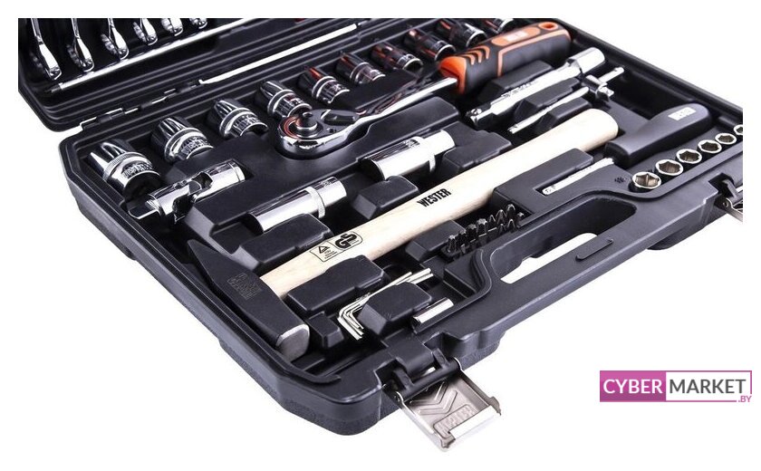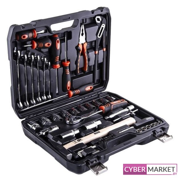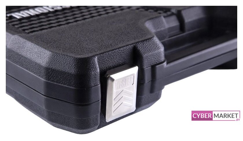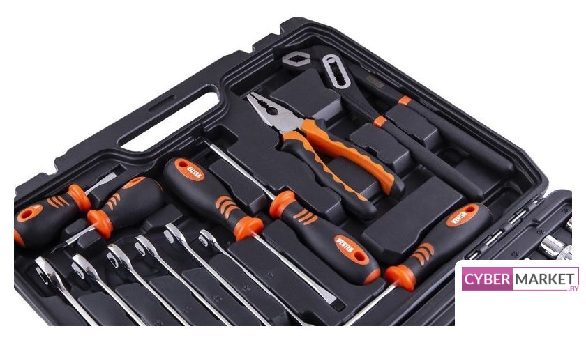 | Комплектация | - Головки торцевые 1/4'' 6 граней: 8, 9, 10, 11, 12, 13 мм- Отвертка - держатель 1/4'' 150 мм- Адаптер для бит 1/4''DR x 1/4''НDR- Биты: L = 25 мм PH1, PH2, PH3, SL3, SL4, SL5, SL6, Т10, Т15,Т20, Т25, Т27, Т30, Т40- Вороток Т - образный 1/4'' 115 мм- Головки торцевые 1/2'' 6 граней: 10, 12, 13, 14, 15, 17, 19, 22, 24, 27 мм- Свечные головки 1/2'': 16, 21 мм- Трещотка 1/2'' 72 зуба- Удлинитель 1/2'' 125 мм- Кардан 1/2'' 70 мм- Ключи шестигранные Г-образные: 1.5, 2, 3, 4 мм- Ключи комбинированные : 10, 12, 13, 14, 15, 17 мм- Молоток 300 г- Плоскогубцы комбинированные 175 мм- Переставные клещи 250 мм- Отвертки: PH2 x 38 мм, PH2 x 100 мм, PZ3 x 200 мм,SL6 x 38 мм, SL6 x 100 мм |