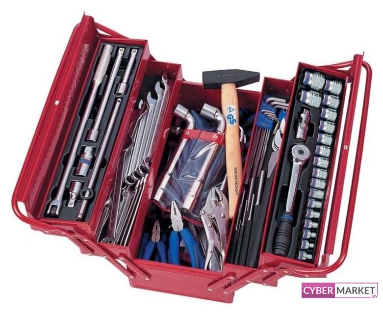 | Комплектация | Отсек 1, Набор торцевых головок KING TONY 9-4319MRГоловки и принадлежности 1/2" (12,7 мм):Головки торцевые стандартные 6-гранные: 10, 11, 12, 13, 14, 15, 16, 17, 18, 19, 20, 21, 22, 23, 24, 27, 30, 32 ммТрещотка: длина 250 мм, 32 зубца, флажковый механизм переключения реверса, насечка на рукояткеКардан: длина 77,5 ммОтсек 2, Набор принадлежностей для торцевых головок KING TONY 9-4116FRПринадлежности 1/2" (12,7 мм):Вороток с шарниром: длина 450 ммВороток скользящий (ползунок): длина 300 ммГоловка свечная шестигранная: 21 мм, длина 70 мм, резиновый фиксаторУдлинители: длина 125 и 250 ммУдлинители: длина 50 мм, шаровый наконечник 15 градусовОтсек 3Ключи комбинированные: 8, 9, 10, 11, 12, 13, 14, 15, 16, 17, 18, 19, 21, 22, 23, 24, 27, 30, 32 ммОтсек 4Набор Г-образных шестигранников с шаровым окончанием KING TONY 20109MR шестигранники: 1.5, 2, 2.5, 3, 4, 5, 6, 8, 10 ммНабор Г-образных TORX, T10-T40, с отверстием, 7 предметов KING TONY 20407PR TORX: T10, T15, T20, T25, T27, T30, T40Зубила: 20 x 175 мм, 26 x 300 ммВыколотки: 2x30 мм, 3x40 мм, 4x50 мм, 5x55 мм, 6x55 мм, 8x60 мм,12x70 мм, 14x75 ммОтсек 5Отвертки крестовые Phillips: №0 х 60 мм, №1 х 100 мм, №2 х 100 мм, №3 х 150 ммОтвертки шлицевые Slotted: 3 х 75 мм, 4 х 100 мм, 5 х 75 мм, 5.5 х 125 мм, 6.5 х 150 мм, 8 х 175 ммПлоскогубцы комбинированные: длина 175 ммПлоскогубцы тонконосые: длина 160 ммБокорезы силовые: длина 200 ммКусачки силовые: длина 250 ммЗахват переставной: длина 250 ммЗажим с фиксатором, с закругленными губками: длина 250 ммКлюч разводной Chrome: длина 300 ммМолоток квадратный: вес 800 гНожовка по металлу: длина 305 ммРулетка измерительная: длина измерений до 3-х метровНабор торцевых L-образных ключей KING TONY 1812MR в виниловом чехле: 8, 10, 11, 12, 13, 14, 16, 17, 18, 19, 22, 24 мм |