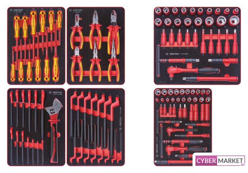 | Комплектация | Отвертки диэлектрические Phillips PH0х75, PH1х100, PH2х100, PH3х150 Отвертки диэлектрические Slotted: 3х75, 4х100, 8х175, 3.5х100, 5.5х125, 6.5х150 Отвертки диэлектрические: Square 1х125, 2х150 Бокорезы диэлектрические, 167 ммПассатижи тонконосые диэлектрические, 210 ммСтриппер диэлектрический, 160 ммПассатижи комбинированные диэлектрические, 185 ммПассатижи тонконосые, загнутые, диэлектрические 200 ммКабелерез диэлектрический, 214 мм Ключи рожковые диэлектрические: 8, 9, 10, 12, 13, 14, 16, 17, 18, 19, 21, 22, 24 ммКлюч разводной диэлектрический, 310 мм Ключи накидные диэлектрические: 7, 8, 9, 10, 11, 12, 13, 14, 16, 17, 18, 19, 21, 22, 24Головки торцевые диэлектрические короткие 6-гранные 1/2": 8, 9, 10, 11, 12, 13, 14, 15, 16, 17, 18, 19, 21, 22, 24, 27, 30, 32 ммТрещотка флажковая с кнопкой 1/2" 24 зубца, 250 ммВороток Т-образный 1/2" 200 мм Удлинители диэлектрические 1/2" 125, 250 мм Насадки (биты) торцевые диэлектрические 1/2", длина 75 мм HEX: H4, H5, H6, H8, H10Насадки (биты) торцевые диэлектрические 1/2", длина 120 мм HEX: H4, H5, H6, H8, H10Головки торцевые диэлектрические короткие 6-гранные 3/8": 10, 11, 12, 13, 14, 15, 16, 17, 18, 19 мм Головки торцевые диэлектрические глубокие 6-гранные 3/8": 8, 10, 12, 14 мм Трещотка флажковая с кнопкой 3/8" 24 зубца, 200 мм Вороток Т-образный 3/8" 200 мм Удлинители 3/8" – 150, 250 мм Головки торцевые диэлектрические короткие 6-гранные 1/4": 5, 6, 7, 8, 9, 10, 11, 12, 13, 14 мм Трещотка флажковая с кнопкой 1/4" 24 зубца, 150 мм Вороток Т-образный 1/4" 125 ммУдлинители 1/4" 100, 150 мм Насадки (биты) торцевые диэлектрические 3/8", длина 65 мм HEX: H8, H10 Насадки (биты) торцевые диэлектрические 1/4", длина 54 мм HEX: H3, H4, H5, H6 |