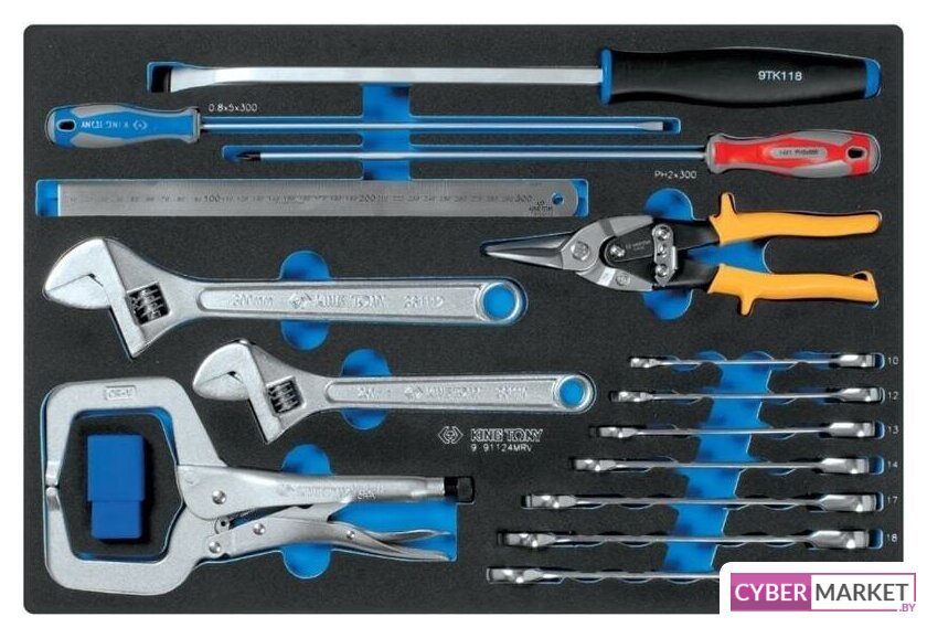 | Комплектация | КлючиКлючи трещоточные комбинированные: 10, 12, 13, 14, 17, 18, 19 ммКлюч разводной: 250 мм, развод: до 30 ммКлюч разводной: 300 мм, развод: до 35 ммОтверткиОтвертка PHILLIPS: PH2×300 ммОтвертка SLOTTED: 5×300 ммШарнирно-губцевый инструментНожницы по металлу: 250 мм, режущая кромка: 38 ммЗажим с фиксатором С-образный: 280 мм, захват/глубина: до 100 ммУдарный инструментМонтировка: 458 ммУдарные клейма: «1, 2, 3, 4, 5, 6(9), 7, 8»: 8×8×61 ммИзмерительный инструментЛинейка металлическая, мм/дюйм: 335×23.7×1 мм |