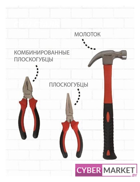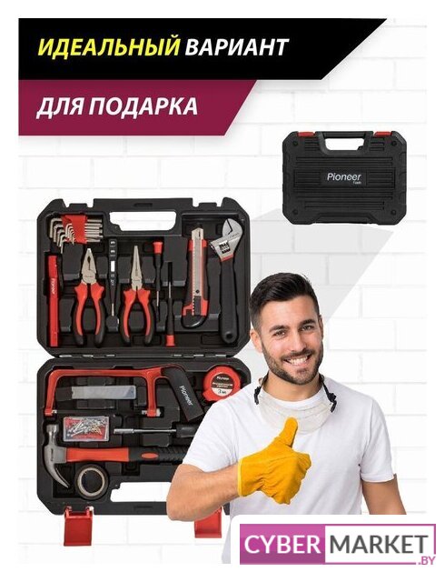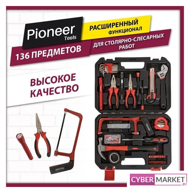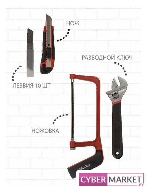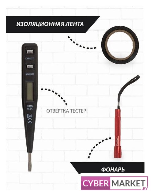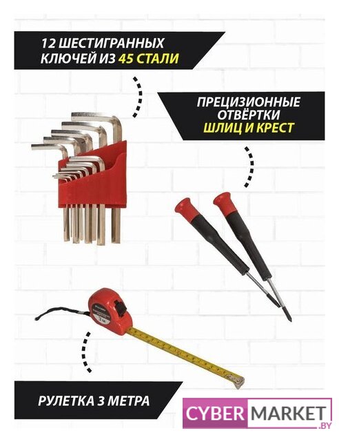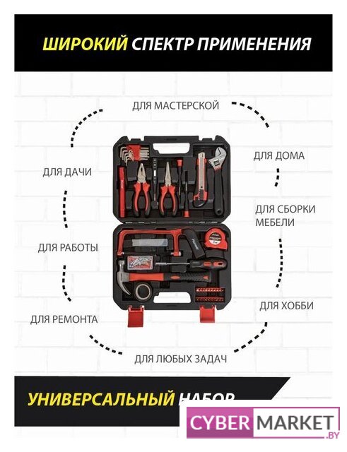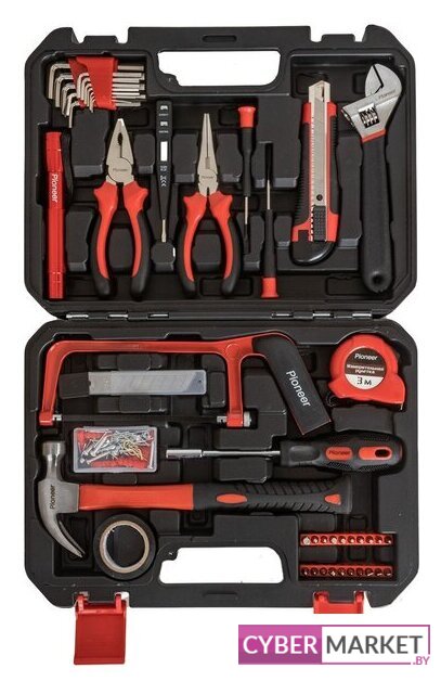 | Комплектация | Нож канцелярский, 1 шт., Биты, 20 шт., Держатель для бит, 1 шт., Прецизионные отвертки, 2 шт. (шлиц, крест), Отвёртка-тестер, 1 шт., Рулетка, 1 шт. (3 м.), Лезвия для ножа, 10 шт., Разводной ключ 8", 1 шт., Молоток-гвоздодёр, 1 шт., Плоскогубцы 6", 1 шт., Комбинированные плоскогубцы 6", 1 шт., Изолента, 1 шт., Шестигранные ключи, 12 шт. (0,9-1,27-1,5-2-2,5-3-3,5-4-4,5-5-5,5-6), Набор крепежей, 80 шт., Ножовка 6", 1 шт., Фонарь, 1 шт., Кейс, 1 шт. |