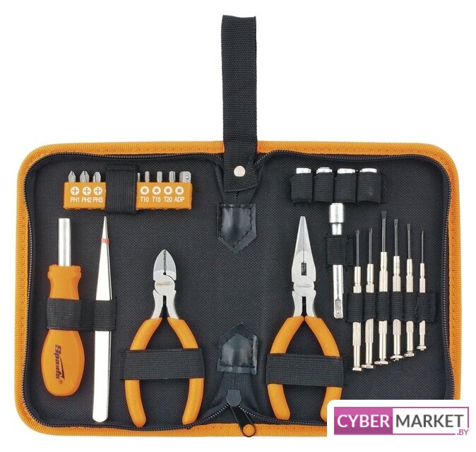 | Комплектация | - длинногубцы,- бокорезы,- отвертка,- переходник,- пинцет,- удлинитель,- шесть часовых отверток,- торцевые головки 7, 8, 9, 10 мм- биты PH 1, PH 2, PH 3, SL 4, SL 6, SL 7, T 10, T 15, T 20. |