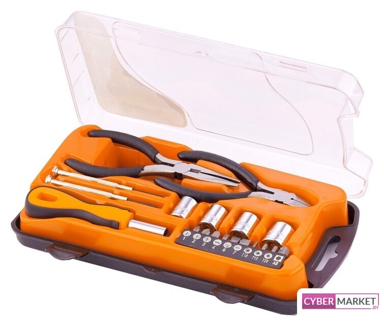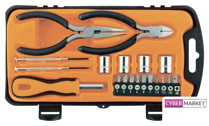 | Комплектация | - длиногубцы,- бокорезы,- отвертка,- переходник, - две часовые отвертки,- торцевые головки 11, 12, 13, 14 мм,- биты PH 1, PH 2 PZ 1, PZ 2, SL 4, SL 5, SL 6, T 10, T 15, T 20. |