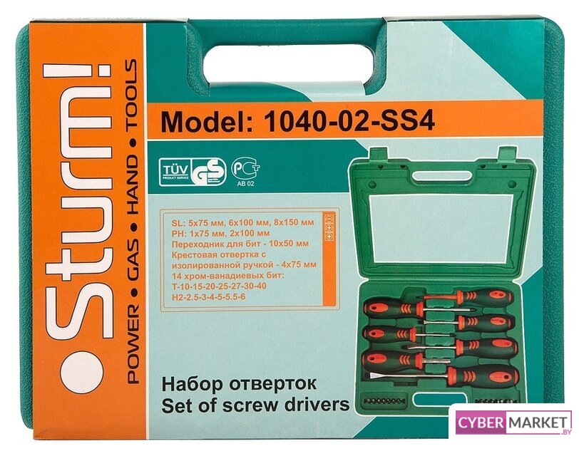 | Комплектация | Отвертки 3 шт (SL 5x75 мм, 6x100 мм, 8x150 мм), отвертки 2 шт (Ph 1x75 мм, 2x100 мм), переходник для бит 10х50 мм), крестовая отвертка с изолированной ручкой 4х75 мм, хромванадиевые биты, 14 шт (torx 10-15-20-25-27-30-40, H2-2.5-3-4-5.5-6), |