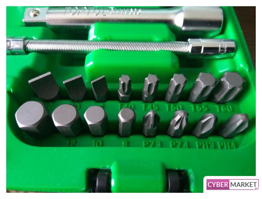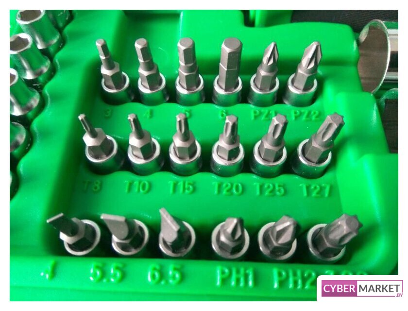 | Комплектация | Головка торцевая 1/4": 4, 4.5, 5, 5.5, 6, 7, 8, 9, 10, 11, 12, 13 ммГоловка торцевая 1/2": 14, 15, 16, 17, 18, 19, 20, 22, 24, 27, 30, 32 ммСвечная головка 1/2" магнитная: 16, 21 ммТрещотка 1/4" 36 зубцов (резиновая ручка)Трещотка 1/2" 36 зубцов (резиновая ручка)Ключи комбинированные 8,10,11,12, 13,14,17,19, 22 ммГоловка с насадкой Hex 1/4": 3, 4, 5, 6 ммГоловка с насадкой Torx 1/4": T8, T10, T15, T20, T25, Т 27, T30Головка с шлицевой насадкой 1/4": 4, 5.5, 6.5 ммГоловка с насадкой PH 1/4": PH1, PH2Насадка PZ 1/4": PZ1, PZ2Насадка 5/16" Hex: 8, 10, 12, 14 ммНасадка 5/16" Torx: T40, T45, T50, T55, 60Насадка 5/16" для ударной отвертки: 8,10,12 ммНасадка 5/16" PZ: PZ3, PZ4Удлинитель 1/4" 50 ммУдлинитель 1/4" 100 ммУдлинитель 1/2" 125 ммУдлинитель 1/2" 250 ммКардан 1/4"Кардан 1/2"Вороток-отвертка 1/4"150 ммВороток 1/4" с плавающей головкой 115 ммДержатель бит 1/2 х 5/16"Гибкий вал 1/4"Переходник 3/8 х 1/2"с отверстием |