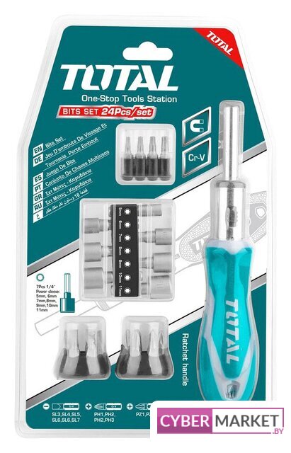 | Комплектация | Отвертка-держатель бит с набором бит и торцевых головок TOTAL TACSD30246 (24 предмета):Биты 6,35x25мм - 16 шт. SL3, SL4, SL5, SL6, SL6, SL7, PH1, PH2, PH2, PH3, PZ1, PZ2, T10, T15, T20, T25Торцевые головки 1/4" - 7шт. 5мм, 6мм, 7мм, 8мм, 9мм, 10мм, 11ммРеверсивная рукоятка держатель - 1 шт.Блистер |
