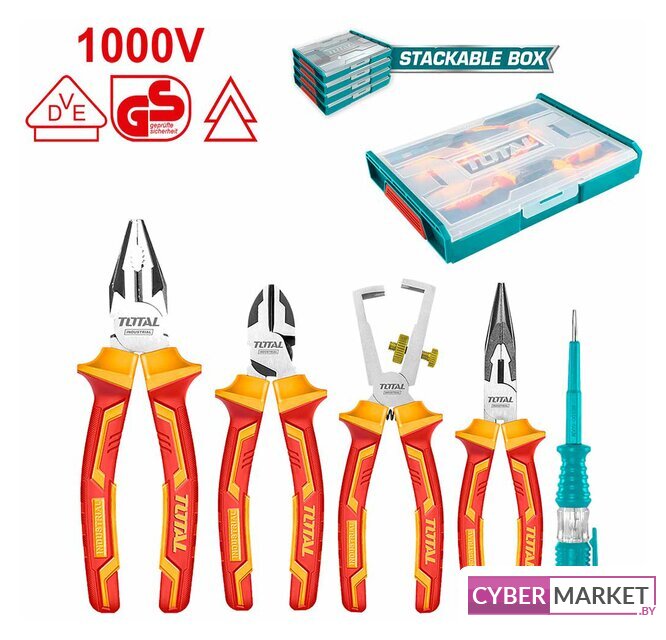 | Комплектация | Изолированные плоскогубцы с длинными губками 160 мм (6 дюймов) - 1 шт.Клещи для зачистки изолированных проводов 160 мм (6 дюймов) - 1 шт.Изолированные бокорезы 160 мм (6 ") - 1 шт.Изолированные комбинированные плоскогубцы 180 мм (7 ") - 1 шт.Индикаторная отвертка 140 мм - 1 шт.Штабелируемый кейс |
