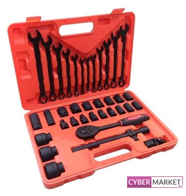 | Комплектация | Усиленные головки 1/2": 8, 9, 10, 11, 12, 13, 14, 15, 16, 17, 18, 19, 20, 21, 22, 24, 27, 30, 32 мм. Головки свечные 1/2": 16, 21 мм. Трещотка 1/2". Ключи рожково-накидные: 8, 9, 10, 11, 12, 13, 14, 15, 16, 17, 18, 19 мм. Удлинитель 1/2"250 мм с адаптером. Кардан 1/2". |