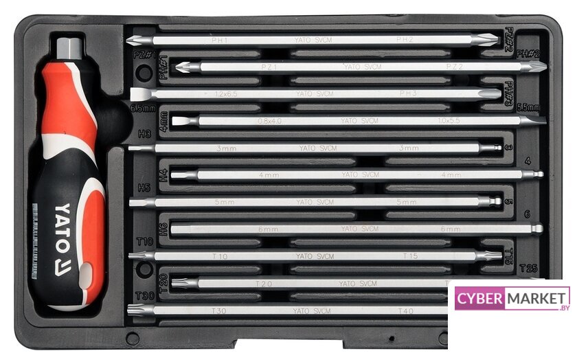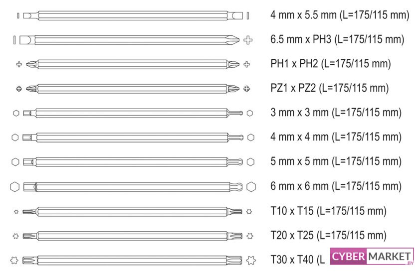 | Отвертки | 11 предмет(ов)(PH, SL, PZ, SQ, T) (двухсторонние) |