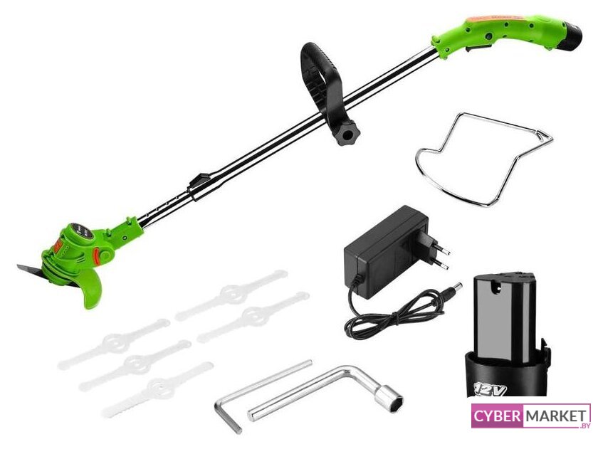 аккумуляторный, 350 Вт, оснастка: металлический нож+пластиковый нож, ширина скашивания 15 см