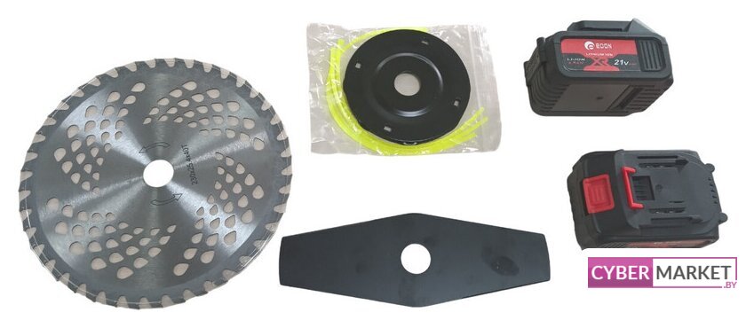 | Комплектация | - Триммер аккумуляторный- Дополнительная рукоятка- Металлический ограничитель/ Защитный кожух- Аккумуляторная батарея 2 шт- Зарядное устройство- Комплект крепежа- Режущий диск/ Режущий нож/ Катушка для лески (Паук) |
