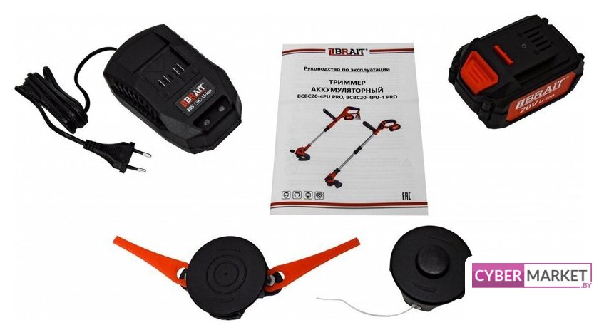| Комплектация | - Триммер в сборе;- Рукоятка;- Защитный кожух;- Скоба защиты растений;- Фиксатор рукоятки;- Катушка с леской;- Катушка с ножами;- Li-Ion аккумулятор 20В, 4 А*ч;- Зарядное устройство 2.4А;- Набор для сборки и монтажа;- Инструкция по эксплуатации. |