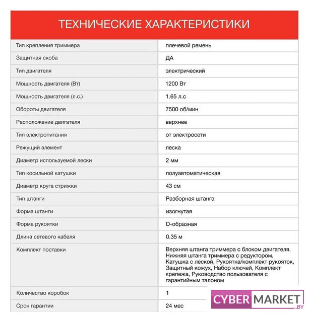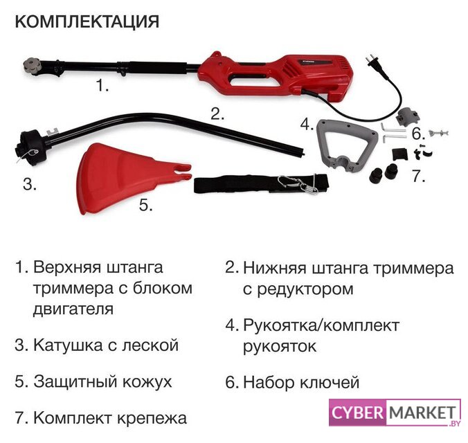 | Комплектация | - Верхняя штанга триммера с блоком двигателя. - Нижняя штанга триммера с редуктором, - Катушка с леской, - Рукоятка/комплект рукояток, - Защитный кожух, - Набор ключей, - Комплект крепежа, - Руководство пользователя с гарантийным талоном. |