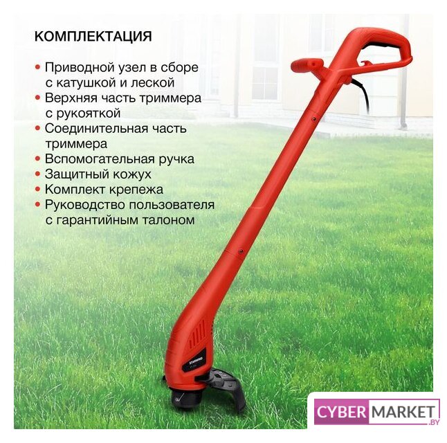 | Комплектация | - Приводной узел в сборе с катушкой и леской- Верхняя часть триммера с рукояткой- Соединительная часть триммера- Вспомогательная ручка- Защитный кожух- Комплект крепежа- Руководство пользователя с гарантийным талоном |