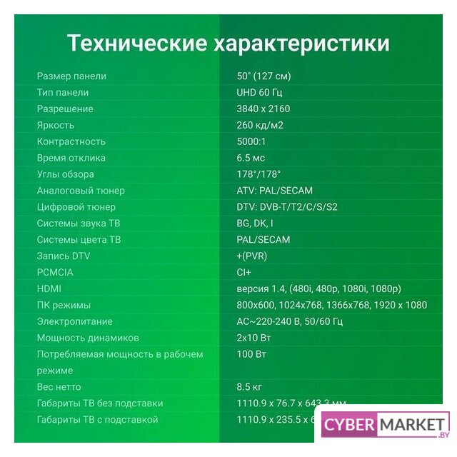 50" 3840x2160 (4K UHD), частота матрицы 60 Гц, Smart TV (Android TV), HDR10, HDR10+, HLG, DTS:X, DTS Virtual: X, AirPlay, Wi-Fi, смарт пульт