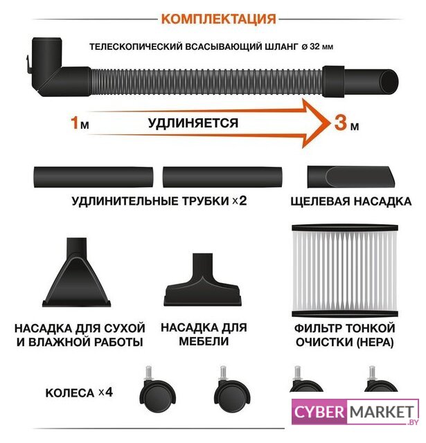 | Дополнительные насадки | насадка для влажной уборки, гибкий шланг |