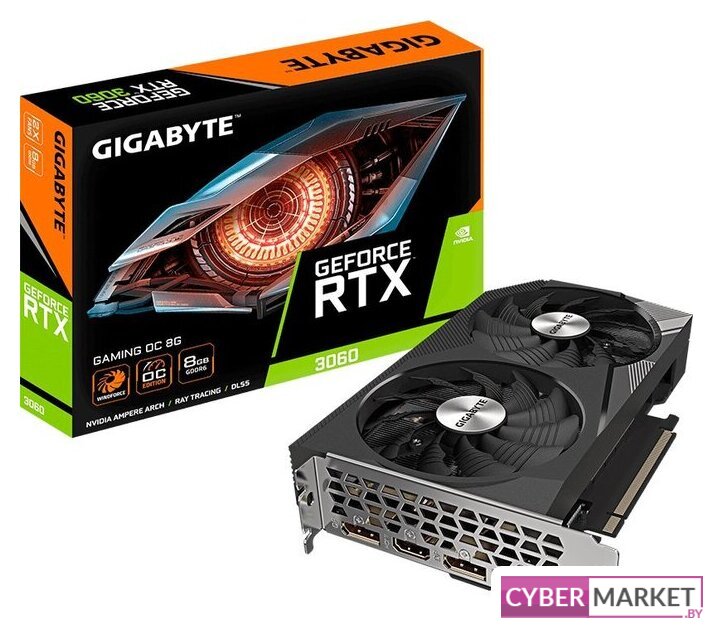 NVIDIA GeForce RTX 3060, базовая частота 1320 МГц, макс. частота 1807 МГц, 3584sp, частота памяти 15000 МГц, 192 бит, доп. питание: 8 pin, 2 слота, HDMI, DisplayPort