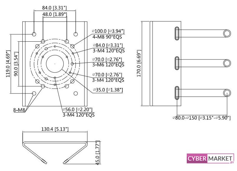 для проекторов, настенный/потолочный, поворотный, кабель-канал, цвет серебристый