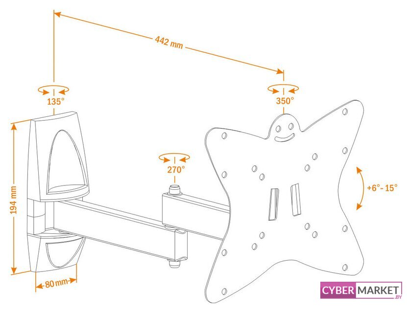 для ЖК-телевизоров, 32-65", настенный, поворотный, наклон 20°, поворот 180°, цвет черный