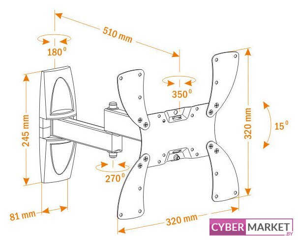 для ЖК-телевизоров, 32-65", настенный, поворотный, наклон 20°, поворот 180°, цвет черный