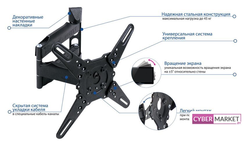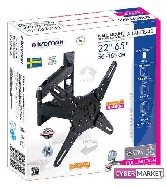 для ЖК-телевизоров, 32-55", настенный, поворотный, наклон 30°, поворот 180°, цвет черный