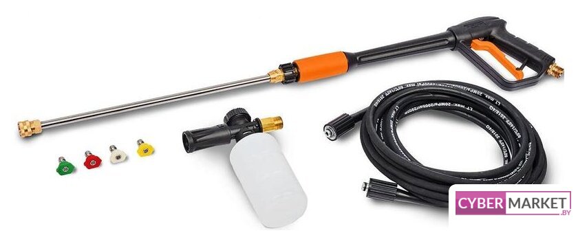 | Комплектация | • Мойка высокого давления;• Пистолет;• Шланг высокого давления;• Насадка на пистолет распылительная;• Четыре быстросъемные насадки на сопло;• Дополнительный фильтр тонкой очистки;• Быстросъемный коннектор;• Пеногенератор;• Игла для прочистки сопла;• Руководство пользователя;• Гарантийный талон. |