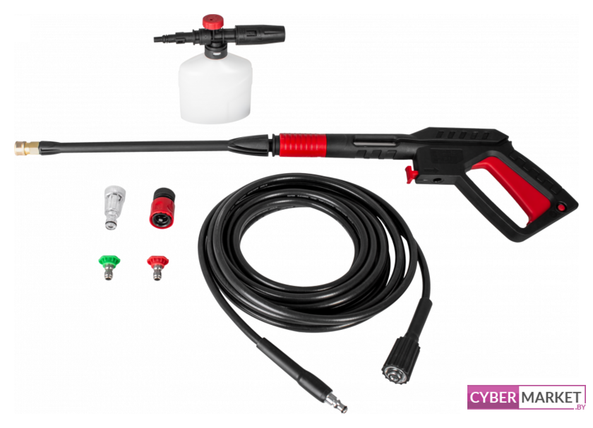 | Комплектация | - Мойка высокого давления 1 шт.- Пистолет-распылитель разборный 1 шт.- Шланг высокого давления 1 шт.- Пеногенератор 1 шт.- Игла для очистки сопла 1 шт.- Сменные форсунки 2 шт.- Фильтр 1 шт.- Быстросъёмный коннектор для подачи вод |
