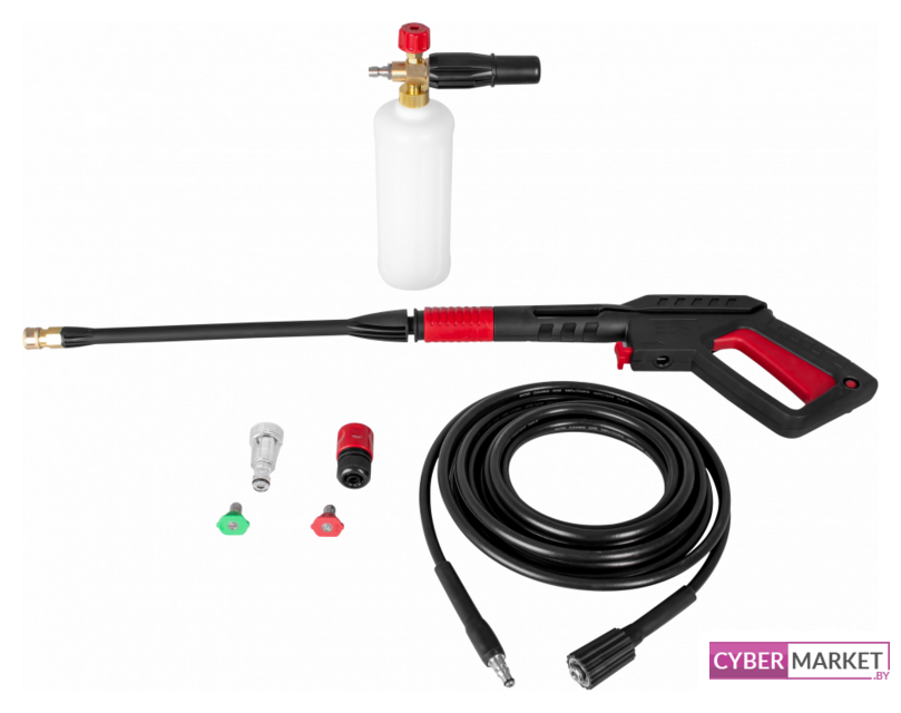 | Комплектация | - Мойка высокого давления 1 шт.- Пистолет-распылитель разборный 1 шт.- Шланг высокого давления 1 шт.- Пеногенератор 1 шт.- Игла для очистки сопла 1 шт.- Сменные форсунки 2 шт.- Фильтр 1 шт.- Быстросъёмный коннектор для подачи вод |