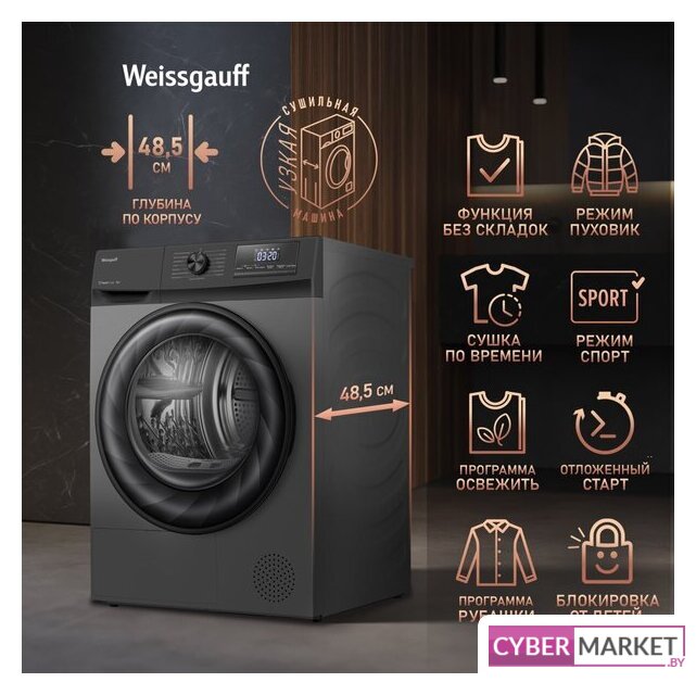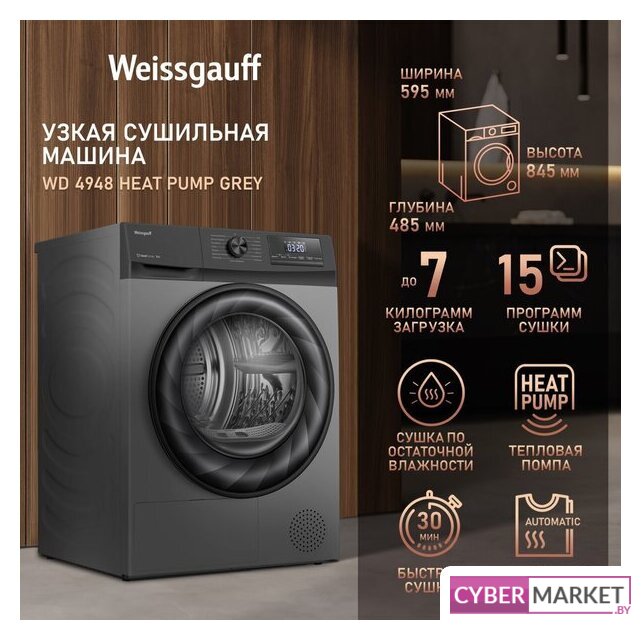 отдельностоящая, сушильная машина, сушка: конденсация с тепловым насосом, загрузка до 8 кг, глубина 61 см, энергопотребление A+, 16 программ